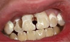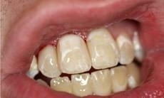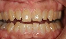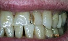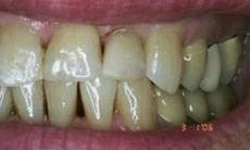 The Challenge: "A" had developed severe wear on all of his teeth to the point where his lower front teeth were biting into the roof-of-the-mouth. This repeated trauma was stripping the gums away from the back side of the upper front teeth. "A.'s" teeth had become very sensitive to hot and cold thermal changes. Additionally, his upper front teeth were tipped inward and thinning from the underneath side due to excessive wear. The thinning had resulted in the edges of the front teeth becoming very weak and, therefore, chipping. The Solution: In an effort to reduce the wear and change ...