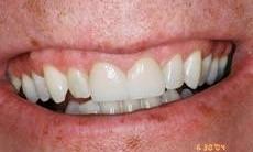 The Challenge: Due to an accident, "D." came to us with several badly fractured front teeth. He asked if we could put him back together as good as before the accident. The Solution: I placed two all ceramic crowns on the broken upper front teeth.