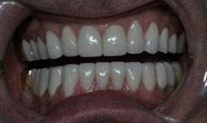 The Challenge: "A" had developed severe wear on all of his teeth to the point where his lower front teeth were biting into the roof-of-the-mouth. This repeated trauma was stripping the gums away from the back side of the upper front teeth. "A.'s" teeth had become very sensitive to hot and cold thermal changes. Additionally, his upper front teeth were tipped inward and thinning from the underneath side due to excessive wear. The thinning had resulted in the edges of the front teeth becoming very weak and, therefore, chipping. The Solution: In an effort to reduce the wear and change ...